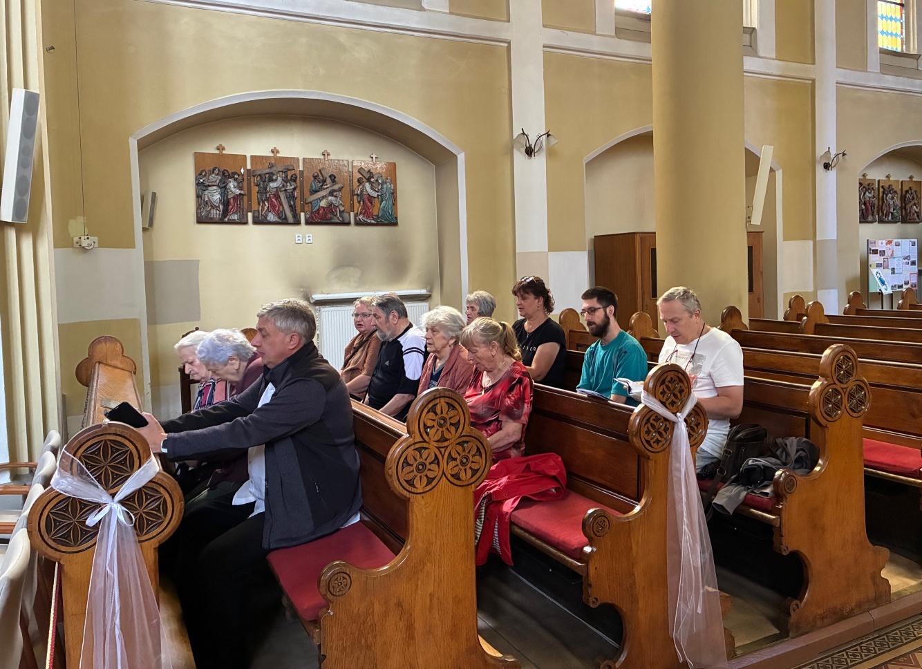Červencová pouť do kostela Nejsvětějšího srdce Ježíšova nás také nezklamala pravým letním počasím a na společné fotografii všichni poctivě mhouřili oči do sluníčka 🙂 Náš program začal tradičně růžencem a pokračoval přivítáním havířováka P. Jendy Svobody, který nám posloužil bohoslužbou slova i sv. přijímáním. Nakonec se nás ujal zasloužilý jáhen a kostelník chrámu, který nám povyprávěl stručnou historii této novogotické stavby a její zvláštnosti. Všichni dostali razítko do poutního pasu. Po návratu jsme ještě stihli malé agapé. Těšíme se na další srpnové putování.